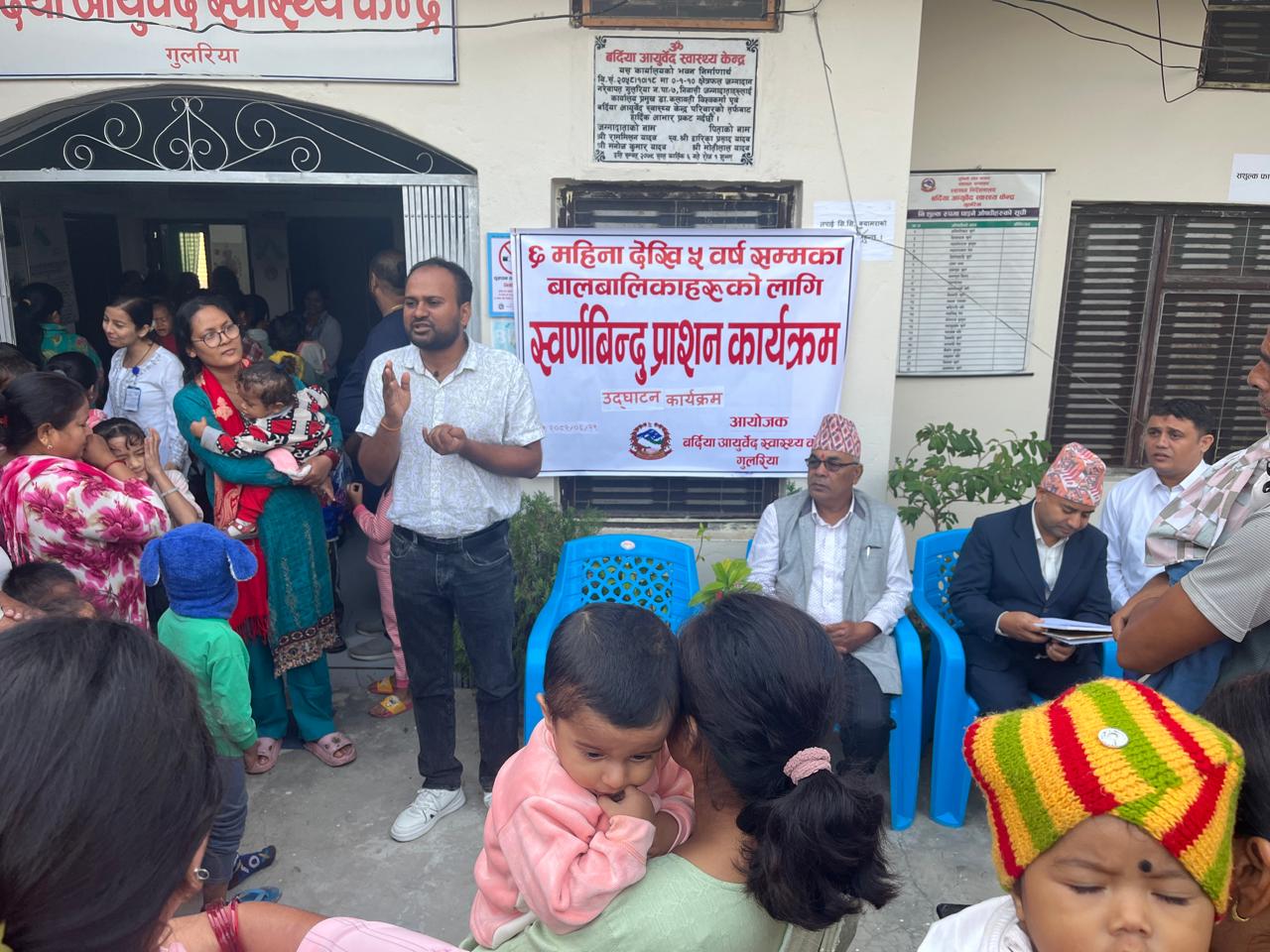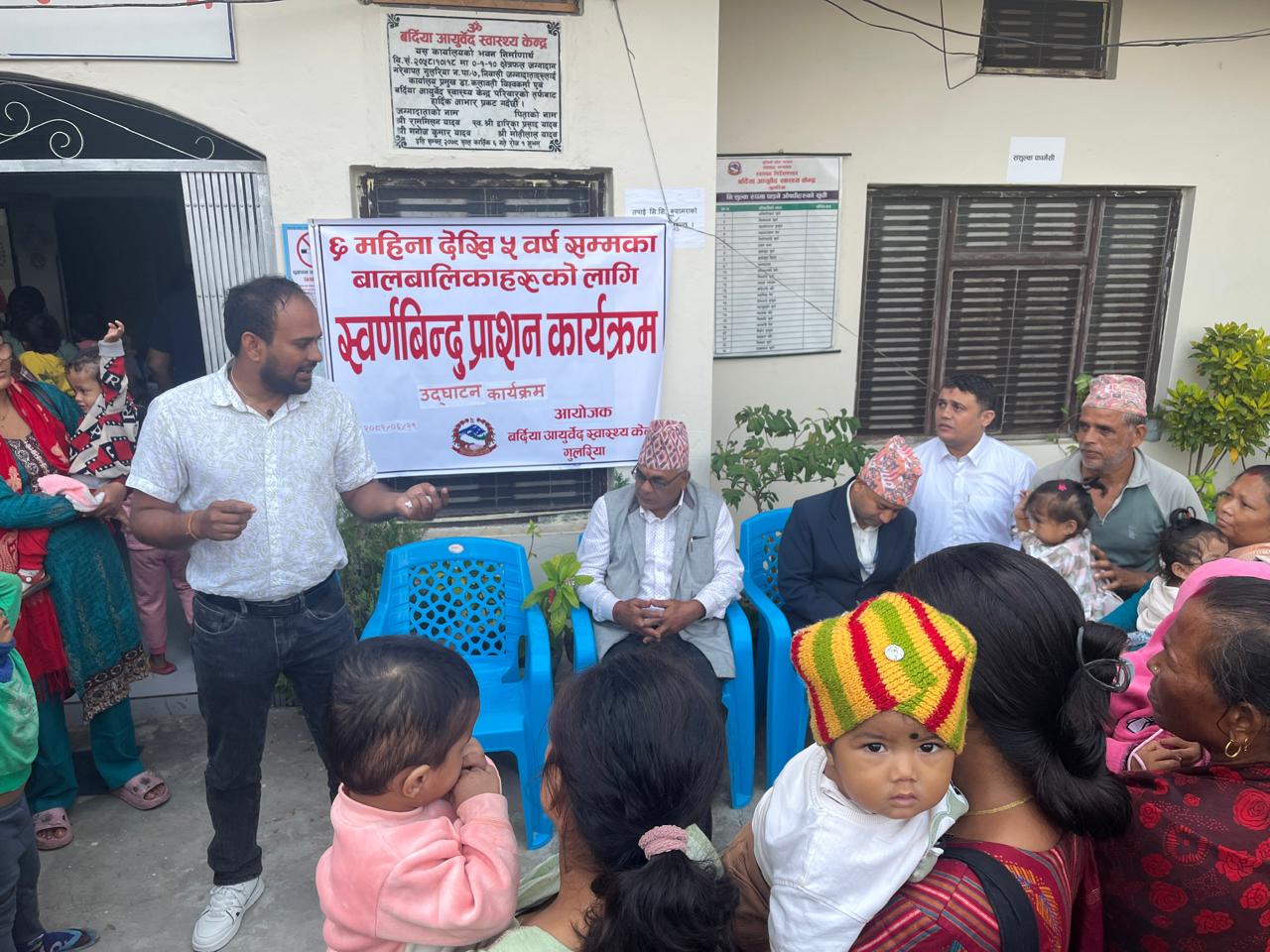 नेपाल सरकार स्वास्थ्य तथा जनसंख्या मन्त्रालयको राष्ट्रिय कार्यक्रम अन्तर्गत हरेक महिना पुश्य नक्षेत्रमा संचालन हुने गरी खुवाउने गरिन्छ । उक्त कार्यक्रममा वर्दिया आयुर्वेद स्वास्थ्य केन्द्रका निमित्त कार्यालय प्रमुख डा यकराज भण्डारीको अध्यक्षता तथा जिल्ला समन्वय समिति बर्दियाका प्रमुख सूर्यबहादुर विष्टको प्रमुख आतिथ्यतामा भएको कार्यक्रममा प्रमुख अतिथिबाट पहिलो सेवाग्राही बालकलाई स्वर्णबिन्दु प्राशन थोपा खुवाएर उदघाटन गरिएको थियोे ।
