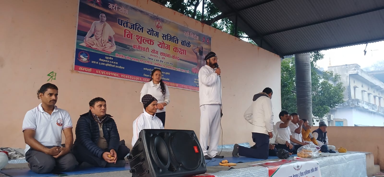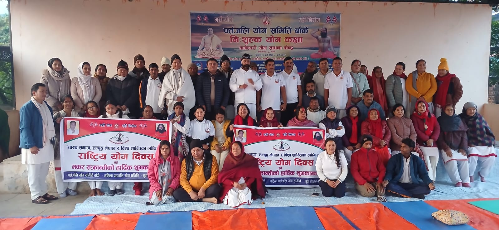 प्रत्येक वर्षको माघ १ गते राष्ट्रिय योग दिवस मनाईने गरिएको छ । यसवर्ष पनि पतञ्जली योग समिति बाँकेका अध्यक्ष हरपाल सिहको सभापतित्वमा भएको कार्यक्रममा युवा पतञ्जली योग समिति लुम्बिनी प्रभारी दुर्गाप्रसाद चौधरी, पतञ्जली युवा समिति बाँके इन्चार्ज इच्छाराम यादव , पतञ्जली महिला योग समिति बाँके उपाध्यक्ष गोमा भट्टराई , पतञ्जजी योग समिति बाँकेका वरिष्ठ उपाध्यक्ष पुष्कर आचर्य नेपालगञ्ज उपमहानगरपालिका अन्तर्गत विभिन्न योग साधना केन्द्रका प्रमुख तथा योगसङ्ग सम्बन्धित ब्यक्तिहरुले राष्ट्रिय योग दिवस तथा योग र स्वास्थ्यका विभिन्न आयामहरुको बारेमा बताएका थिए । कार्यक्रमको सन्चालन पतञ्जली योग समिति बाँकेका महासचिव बिरबहादुर हमालले गरेका थिए ।